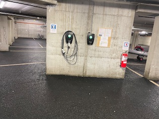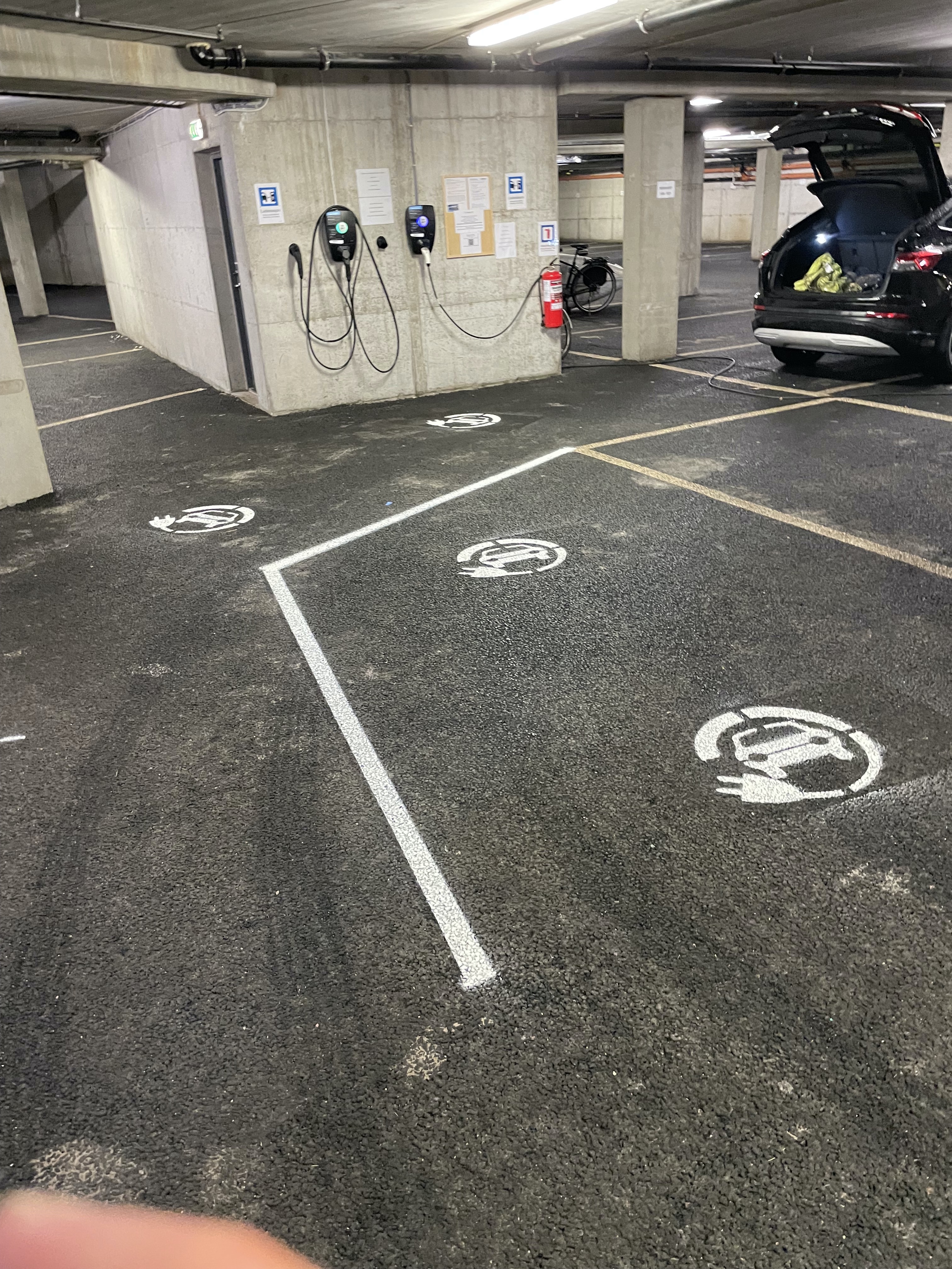 Det er av sikkerhetsmessige årsaker ikke tillatt å lade elbiler i stikk-/veggkontakter i garasjeanlegget eller andre steder i bygningene.